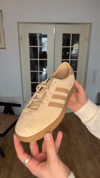 Baskets en daim beige avec trois bandes assorties, semelle en caoutchouc et détails cousus. Présente un profil bas et un design à bout arrondi.
