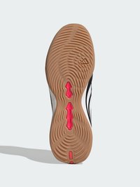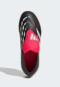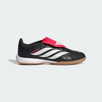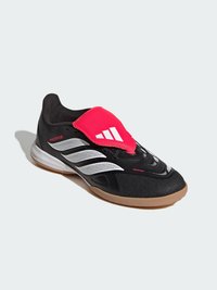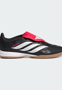 Chaussure de football en salle Adidas Predator basse de couleur noire et rouge avec des rayures blanches et une semelle gomme, vue latérale.