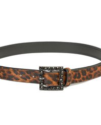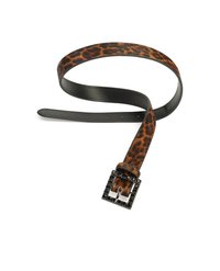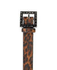Ceinture en cuir à imprimé léopard avec une boucle en métal noir. Elle présente une face intérieure noire lisse et des accents décoratifs autour de la boucle.