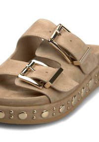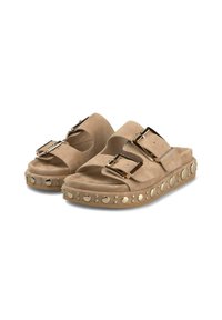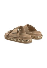 Personne portant des sandales slip-on beiges à clous et un pantalon à jambes larges avec une broderie florale verte, assise sur un canapé marron clair.