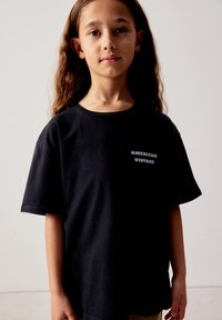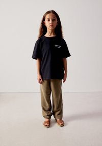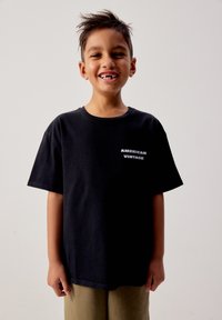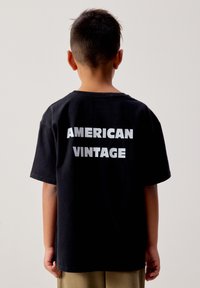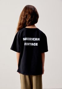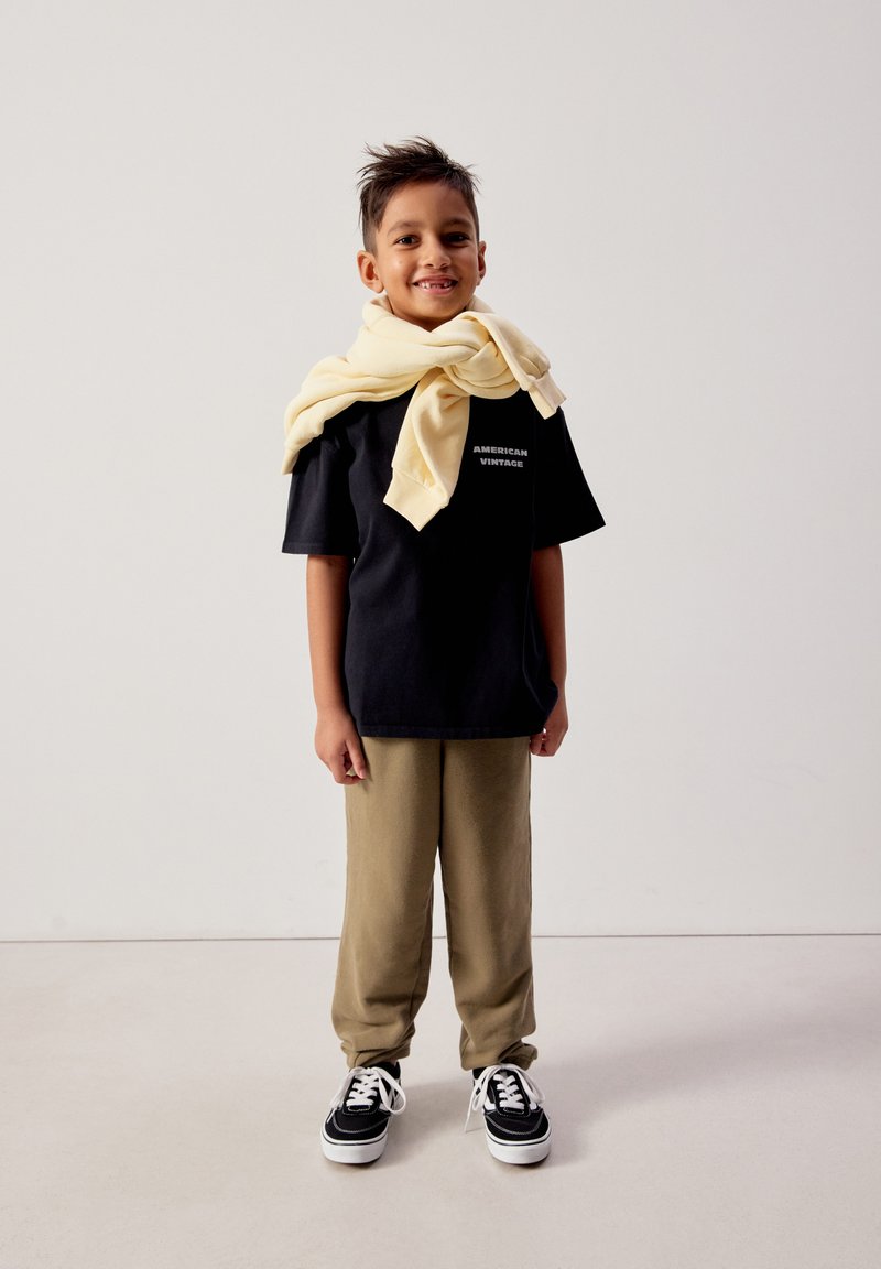 Garçon souriant debout portant un t-shirt noir "American Vintage", un pantalon beige, des baskets noires, avec un pull jaune clair posé sur les épaules.