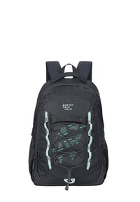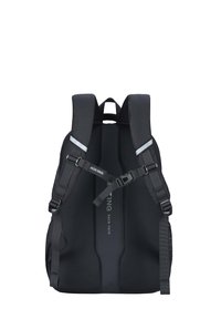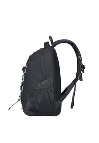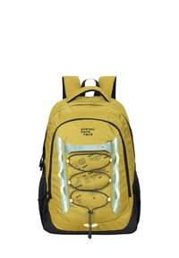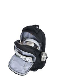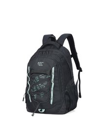 Jeune homme portant un sac à dos noir avec des cordons élastiques à l'avant, un t-shirt blanc et un jean bleu, debout devant un fond clair uni.