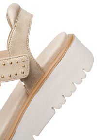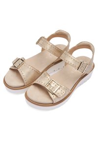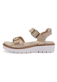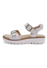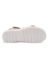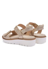 Pieds portant des sandales beiges avec boucles et semelles blanches, associées à un jean denim bleu foncé retroussé, sur un fond uni.