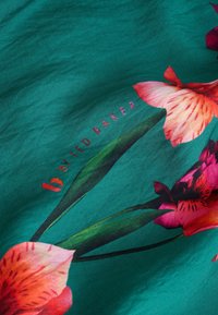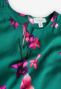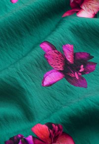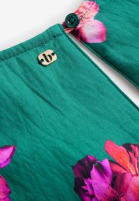Robe midi verte avec manches larges 3/4, imprimé floral rose et violet, et petite fente en V à l'avant.