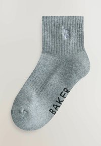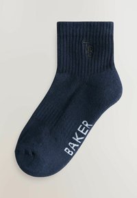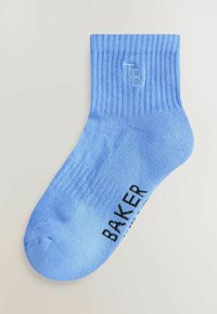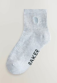 Six paires de chaussettes montantes côtelées en marine, gris, gris clair, blanc, bleu foncé et bleu clair, avec le texte "BAKER" sur la paire bleu clair.
