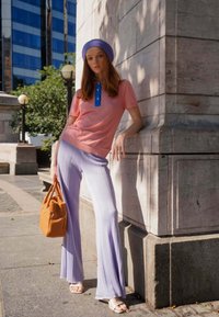 Jeune femme aux cheveux bouclés portant un haut rose à manches courtes avec une patte de boutonnage bleue et une jupe à carreaux bleu et rose.