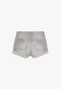 Jeune femme aux longs cheveux foncés portant un t-shirt blanc ajusté et un short en denim gris clair, debout les mains derrière le dos.