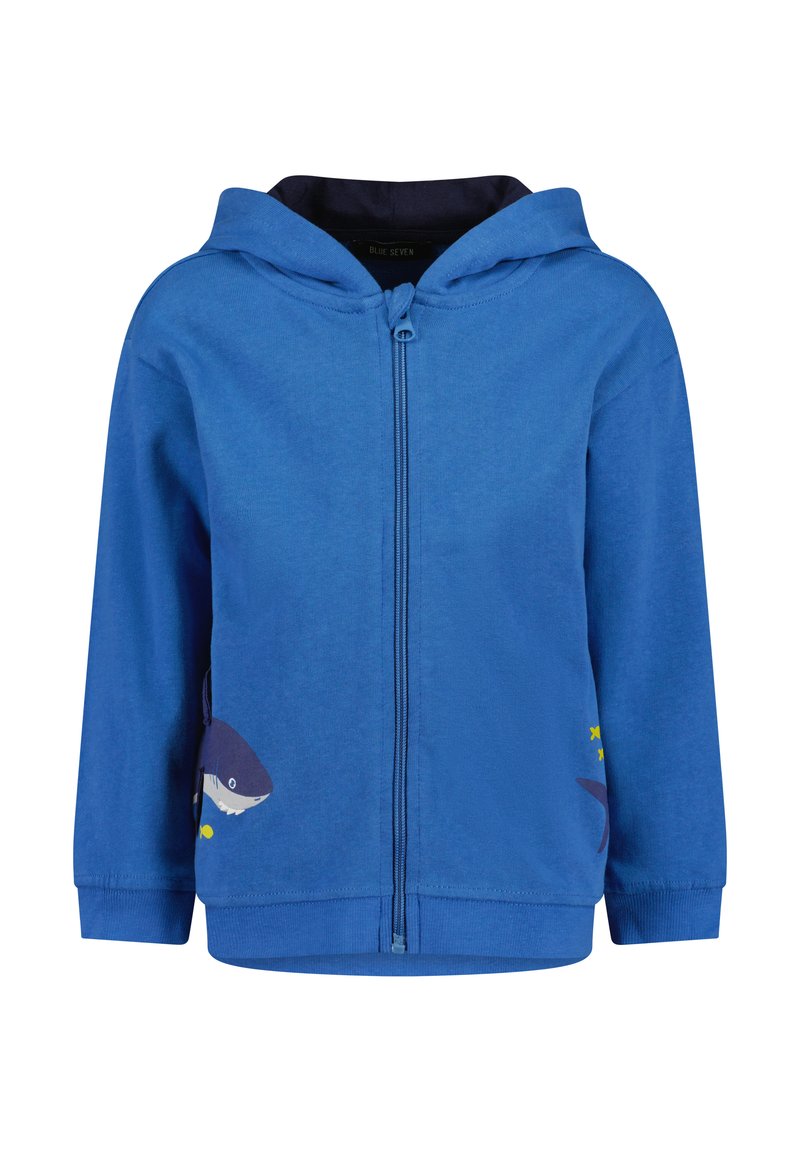 Sweat à capuche zippé bleu en coton ; présente des motifs de requin et des accents d'étoiles sur le devant, avec une capuche doublée et des poignets côtelés.
