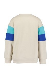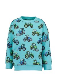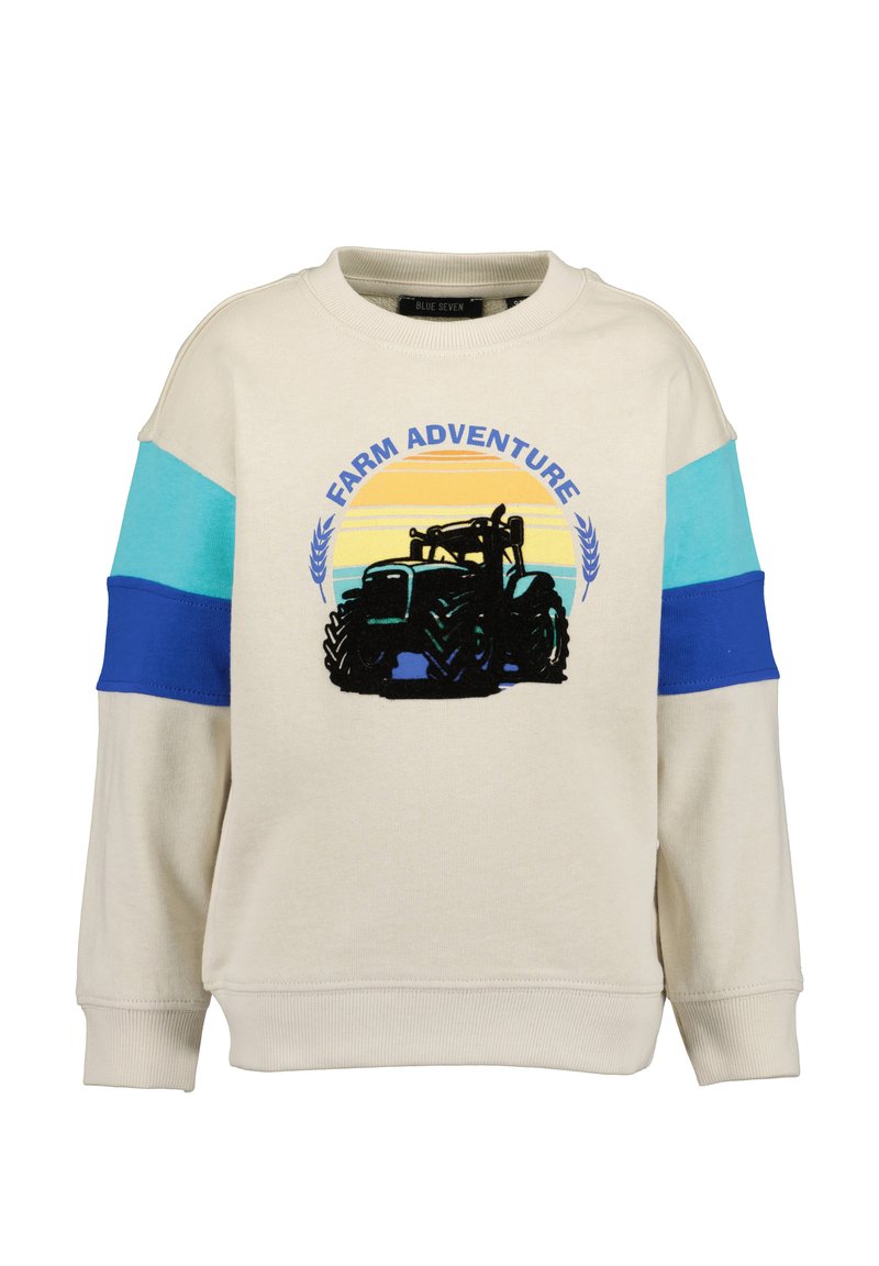 Sweatshirt à col rond en crème avec des manches bleues et turquoise. Il arbore un graphisme de tracteur et le texte "AVENTURE À LA FERME" en marine. Texture douce.