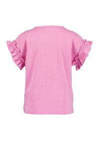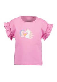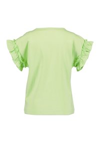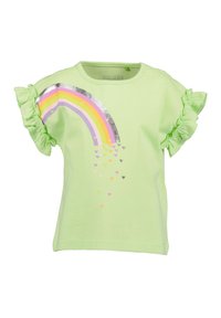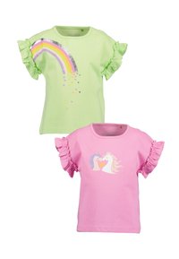 Deux t-shirts à manches courtes : un vert avec un imprimé arc-en-ciel et des manches volantes, un rose avec un graphique de licorne et des manches volantes.