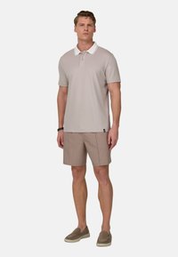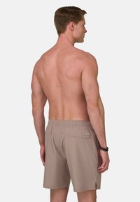 Homme à la peau claire et aux cheveux courts, torse nu, portant un short de bain beige à motifs avec un cordon blanc, debout avec une main dans la poche.