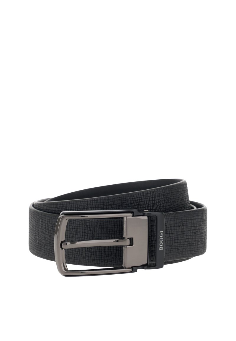 Ceinture en cuir noir texturé avec boucle rectangulaire en métal argenté et gravure "BOGGI" sur le cadre de la boucle, enroulée sur fond blanc.