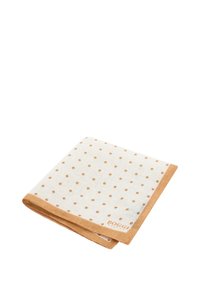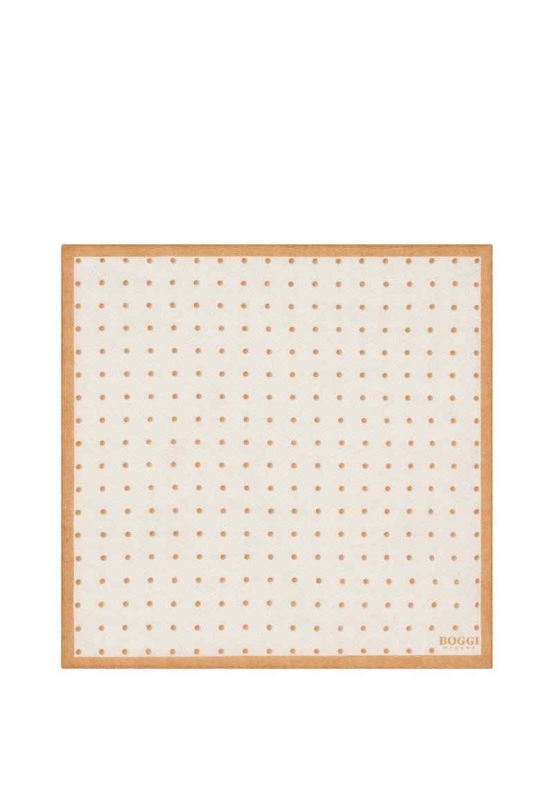 Pochette crème avec des pois marron clair uniformément espacés et une bordure marron clair, marquée "Boggi Milano" dans un coin.