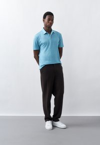 Homme portant un polo à manches courtes bleu clair et un pantalon foncé, regardant sur le côté sur un fond blanc uni.