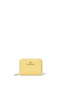 Portefeuille en cuir marron texturé avec fermeture éclair dorée et logo "braccialini" embossé en or au centre avant.