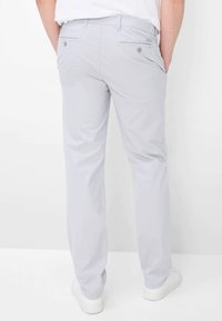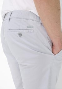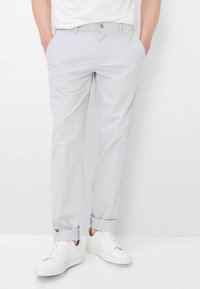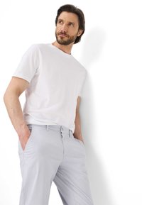 Homme portant un pantalon gris clair retroussé, des baskets blanches et une chemise blanche, les mains dans les poches, debout devant un fond blanc.