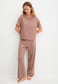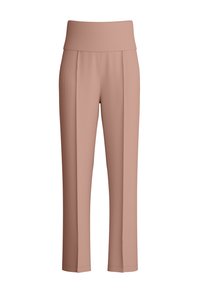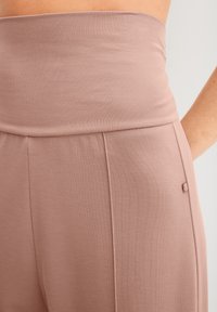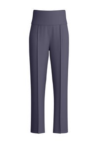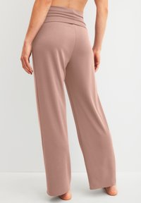 Femme portant un pantalon mauve taille haute à jambes larges avec des coutures frontales, debout pieds nus sur un fond blanc uni.