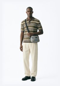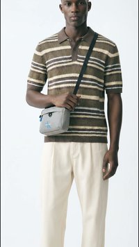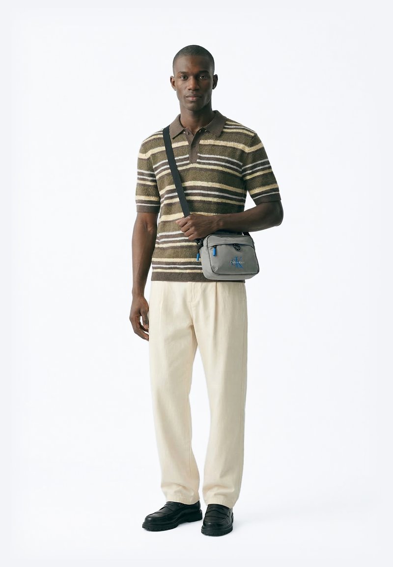 Homme portant un polo rayé marron, un pantalon crème, des chaussures noires, et un sac bandoulière gris avec des accents bleus, debout devant un fond blanc.