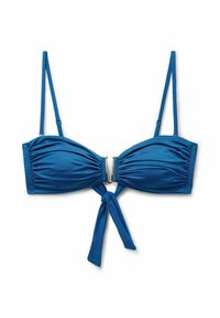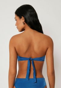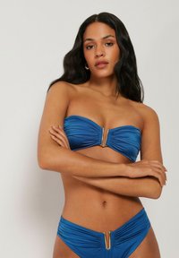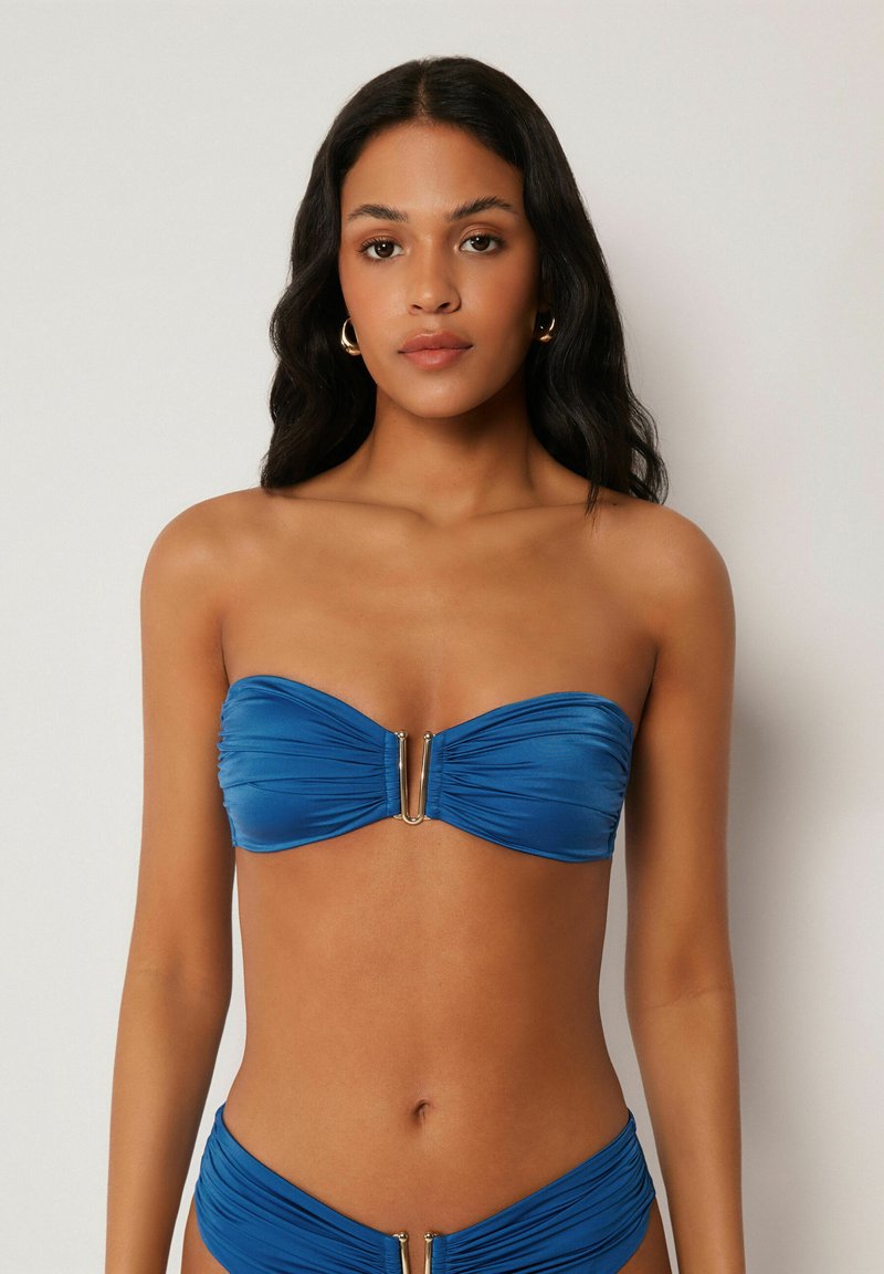 Femme aux longs cheveux noirs portant un bikini bleu froncé sans bretelles avec des détails en métal, debout devant un fond clair uni.