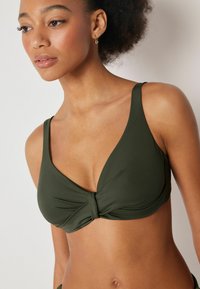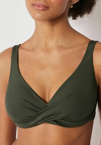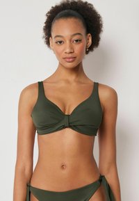 Femme aux cheveux bouclés portant de petites boucles d'oreilles en créole et des clous, vêtue d'un haut de bikini vert olive avec un détail noué au centre.