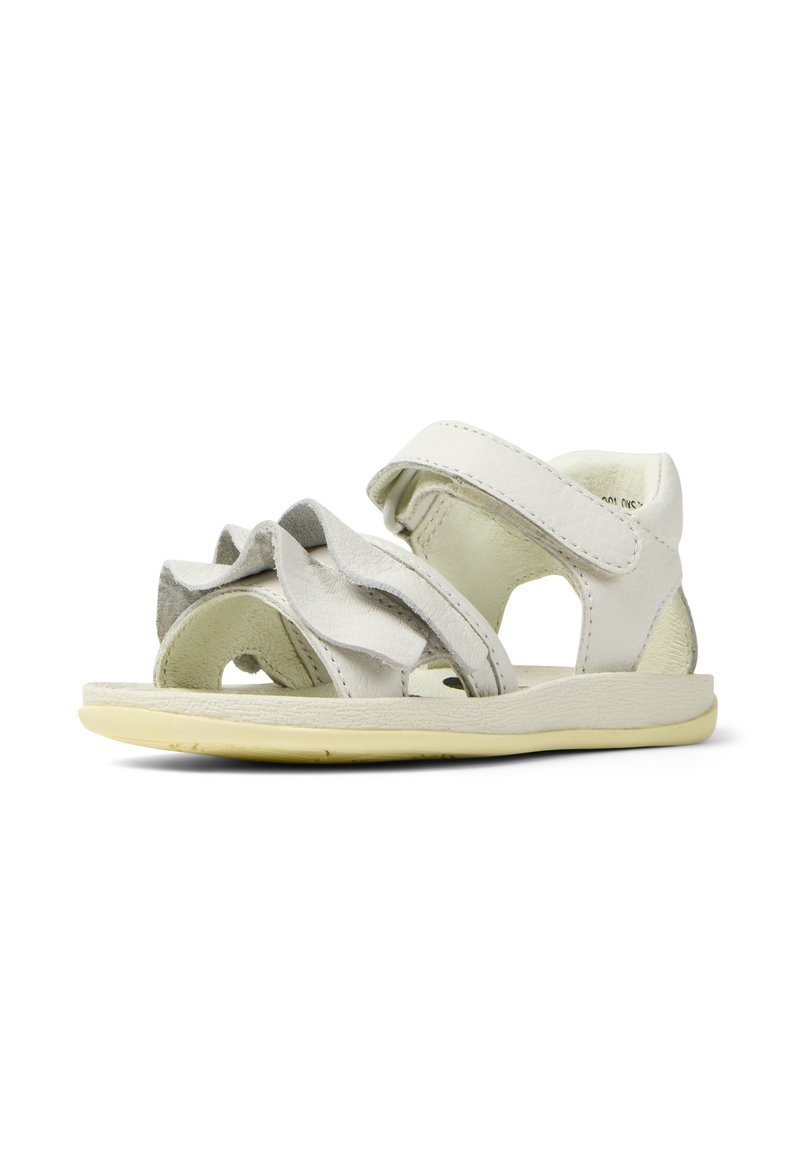 Sandales en cuir blanc avec des accents froncés amusants, des brides en velcro et une semelle en caoutchouc jaune douce. Conception à bout ouvert pour une meilleure respirabilité.