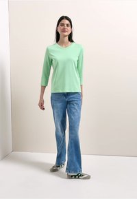 Femme portant une chemise verte à manches longues et un jean bleu avec une casquette navy, tenant une veste beige contre un mur beige clair.