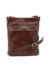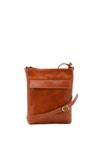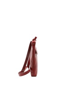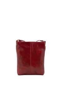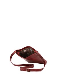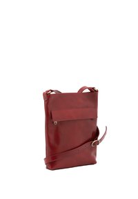 Sac bandoulière en cuir rouge avec poche zippée à l'avant et sangle réglable avec boucle argentée, sur fond blanc.