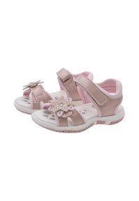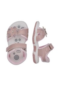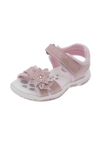 Sandale rose en matière vernie brillante avec un détail floral. Présente des brides ajustables et une semelle en caoutchouc blanche avec des rainures roses.