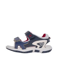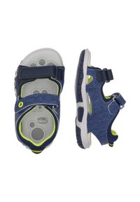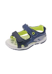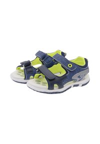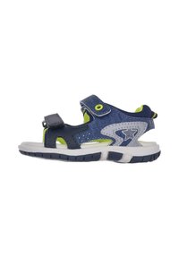 Sandale bleu marine et grise avec des accents verts, dotée d'une bride en Velcro, d'un design ouvert, d'un matériau respirant, et d'une semelle blanche avec une bande de roulement texturée.