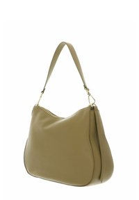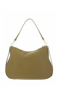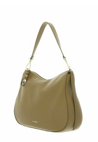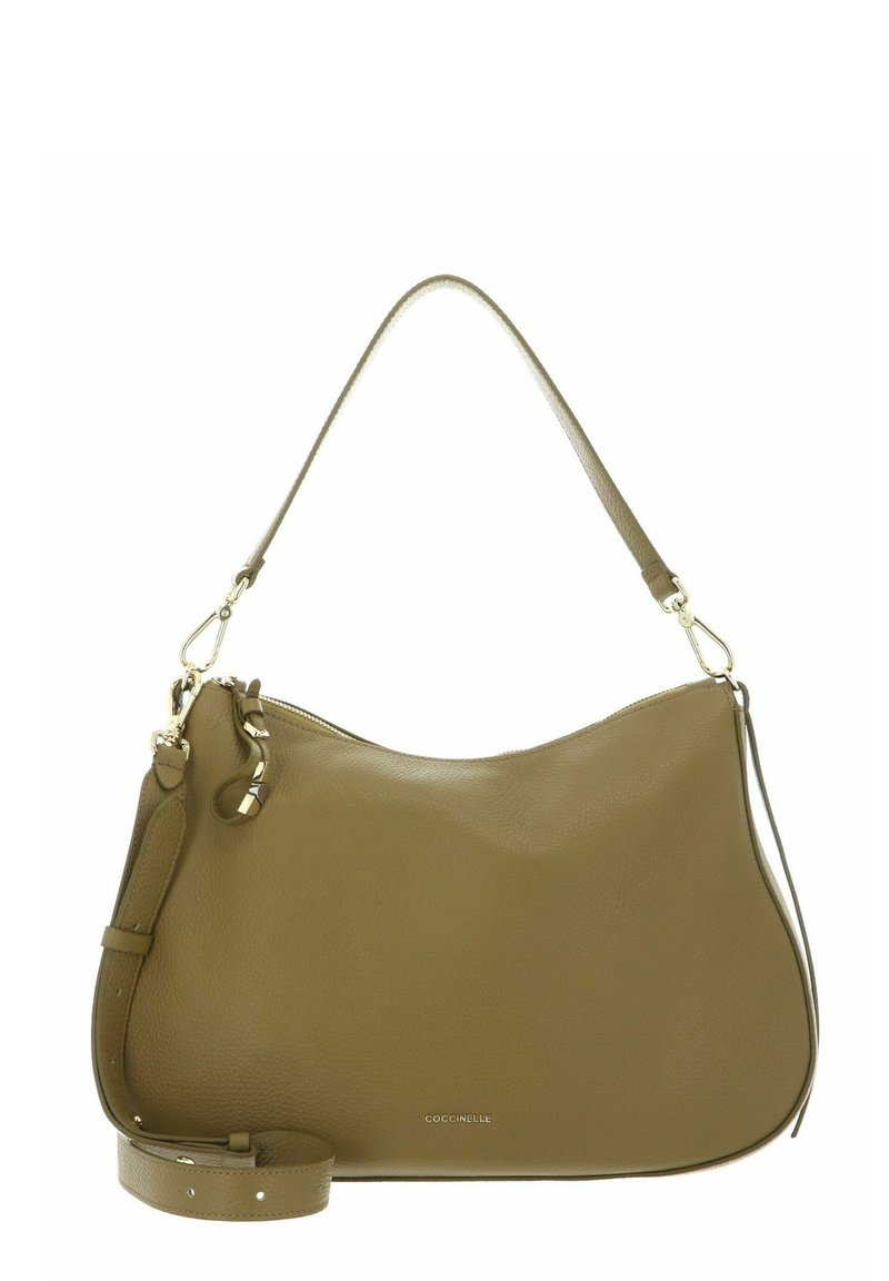 Sac bandoulière en cuir vert olive avec quincaillerie dorée, bandoulière détachable et logo "Coccinelle" au centre avant.