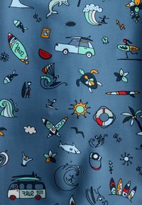 Maillot de bain bébé à manches longues bleu avec des illustrations colorées sur le thème du surf comprenant des vagues, des requins, des planches de surf, des tortues et le soleil.