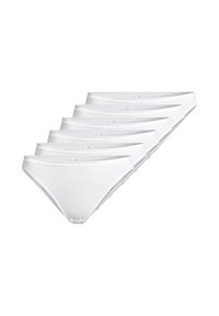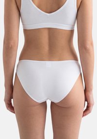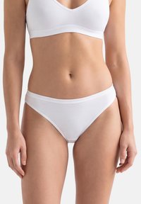 Femme portant un soutien-gorge blanc sans couture et une culotte assortie, debout devant un fond clair uni, tête légèrement inclinée, pose décontractée.