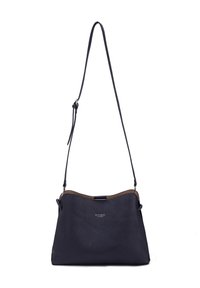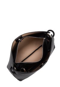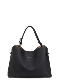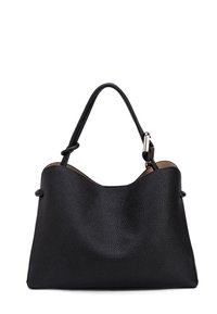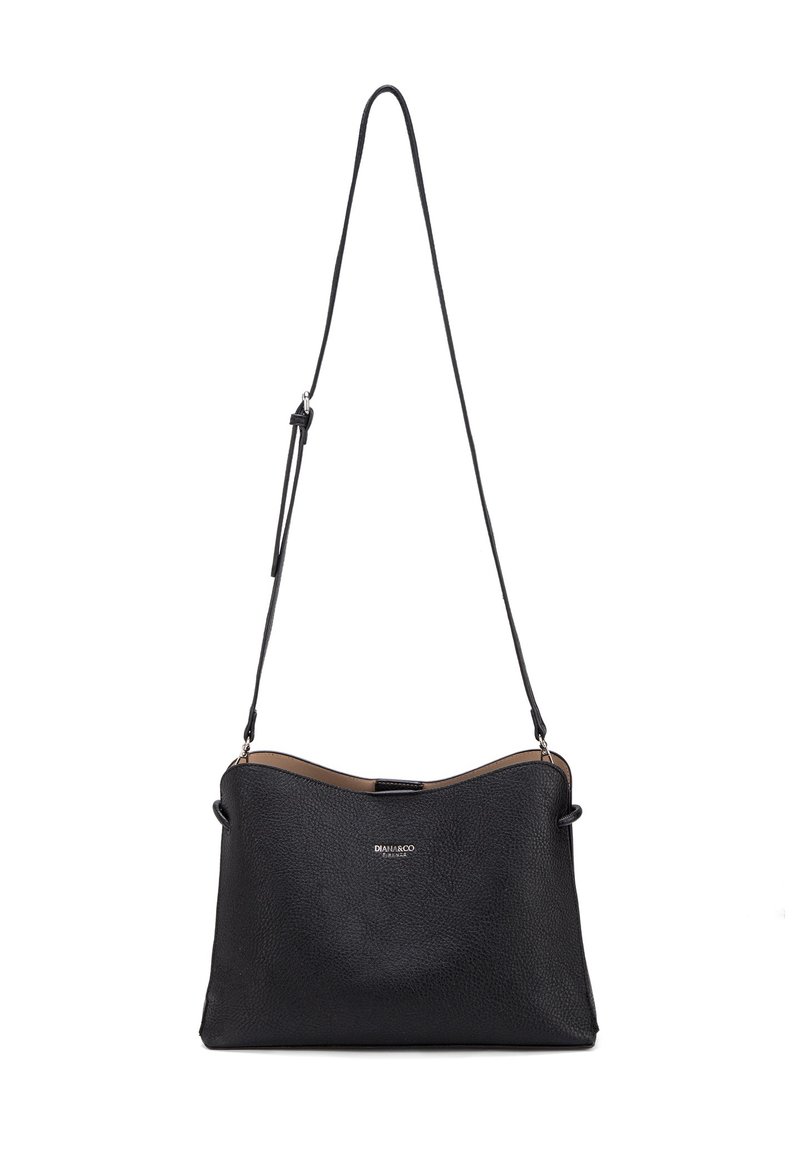 Sac à bandoulière en cuir noir texturé avec une sangle réglable et un petit logo argenté au centre sur le devant.
