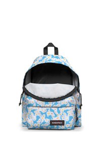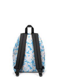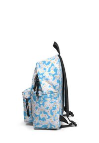 Sac à dos bleu à motifs floraux avec des marguerites blanches, poche avant zippée, poignée noire renforcée et bretelles noires réglables.