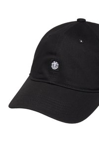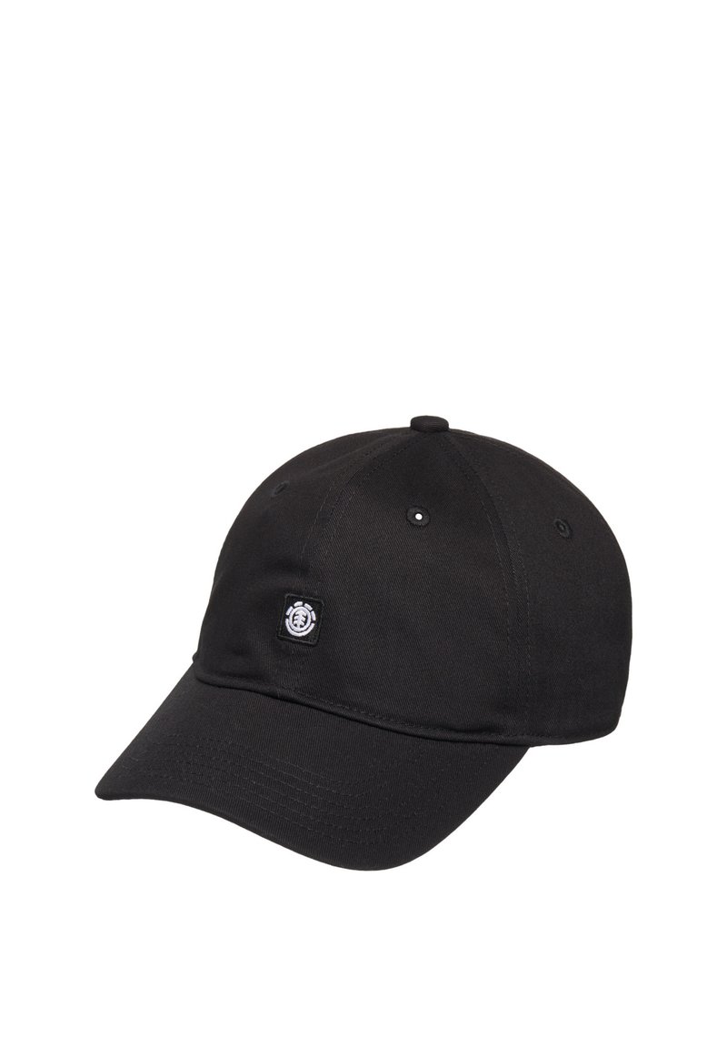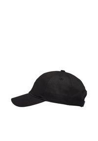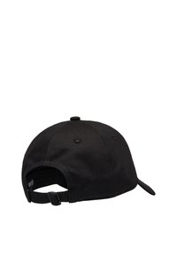 Casquette de baseball noire à six panneaux avec une visière courbée et une petite étiquette de logo blanche sur le panneau central avant.
