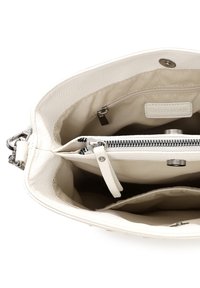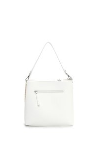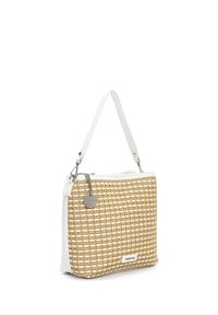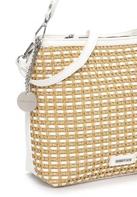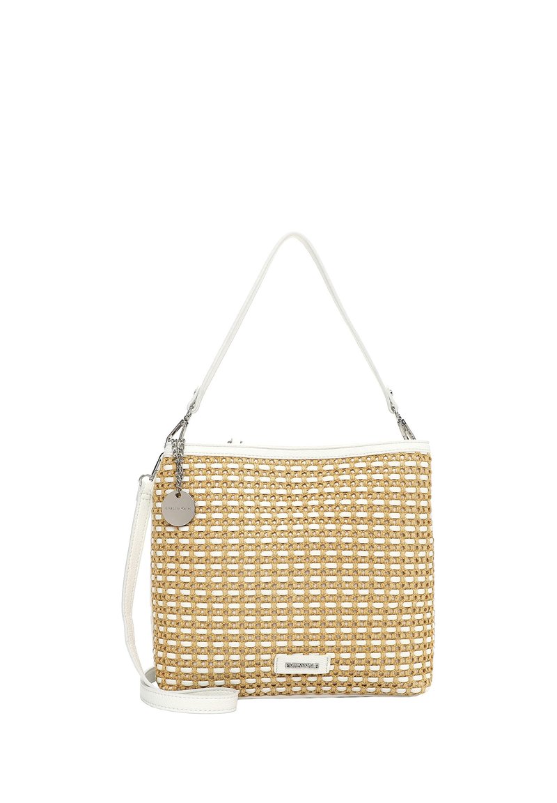 Sac à main tissé en beige et blanc avec des anses en cuir blanc, une chaîne argentée et un pendentif rond, plaque de marque rectangulaire à l'avant.