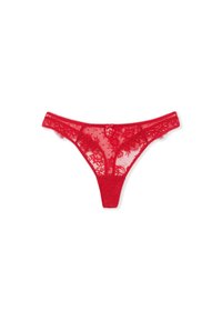 Femme portant un soutien-gorge en dentelle rouge avec bretelles volantées et une culotte haute en dentelle transparente assortie, debout devant un fond blanc uni.