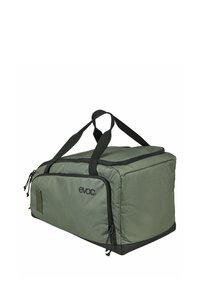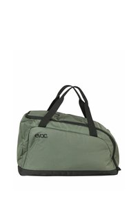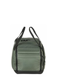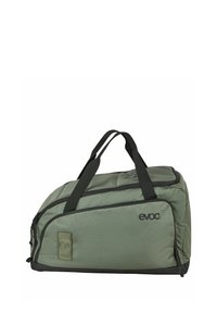 Sac de sport souple vert et noir avec deux poignées noires et une fermeture éclair sur le dessus, arborant le logo "EVOC" sur le côté.