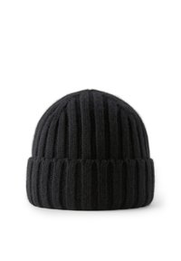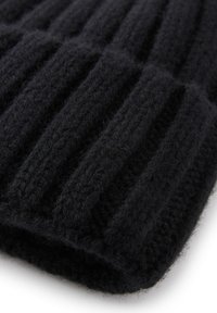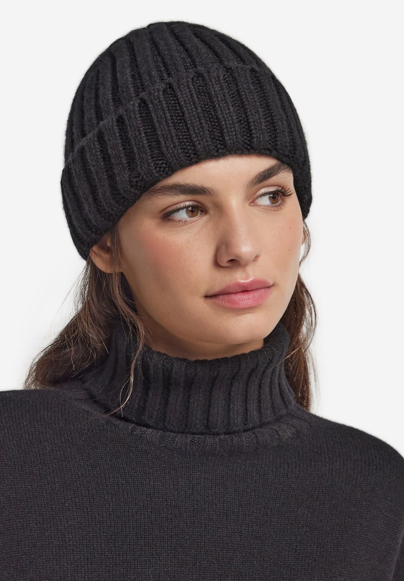 Jeune femme portant un bonnet en tricot côtelé noir et un pull à col roulé côtelé noir assorti, regardant légèrement vers la droite.