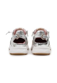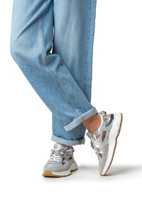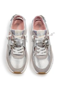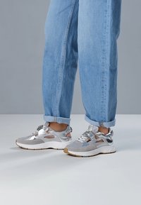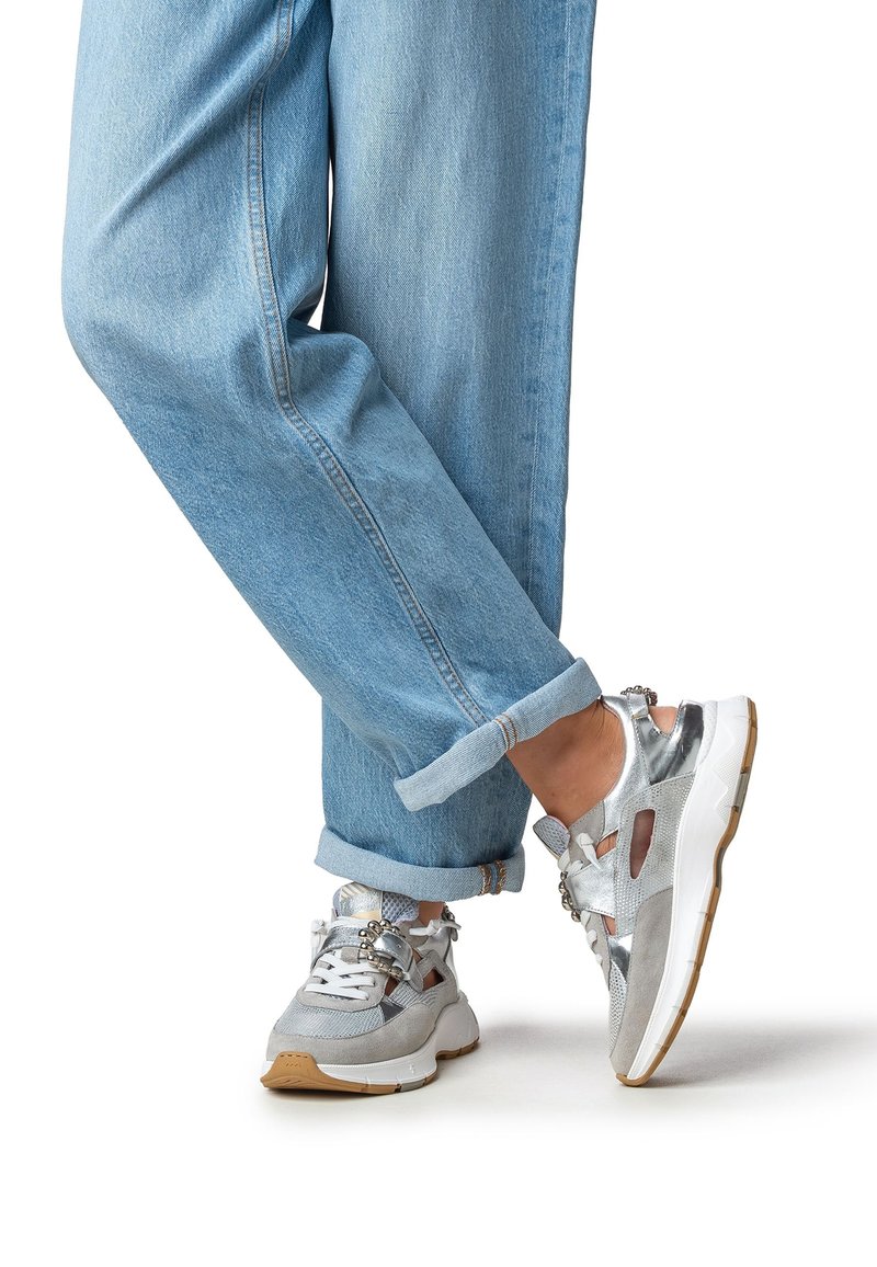 Chaussures de sport argentées avec des superpositions en mesh et en daim, dotées de sections découpées, d'ornements décoratifs et d'une semelle blanche, portées avec un jean en denim retroussé.