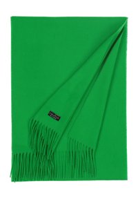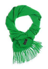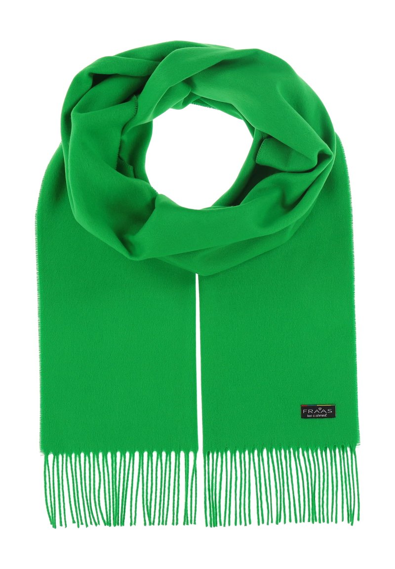 Écharpe verte en tissu doux, avec une texture lisse, des bords frangés et une étiquette avec du texte à une extrémité.