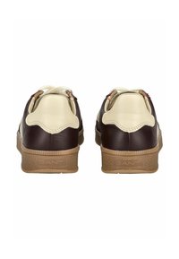 Baskets basses en cuir marron avec accents en suède beige, lacets blancs et semelle en caoutchouc couleur gomme, avec le logo "GANT" sur le côté.