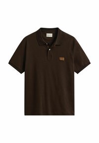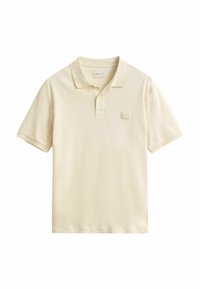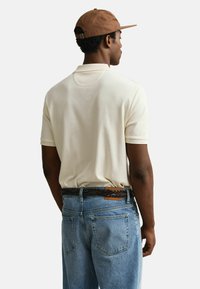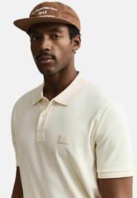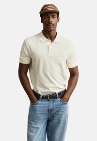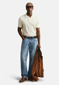Homme portant un polo crème, un jean bleu avec une ceinture tressée foncée, et une casquette marron avec un texte blanc, debout les mains dans les poches.