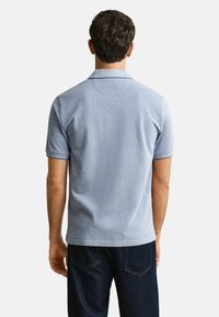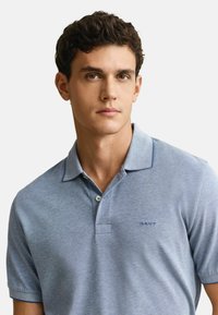 Jeune homme aux cheveux courts et bouclés, portant un polo bleu clair à manches courtes et un jean bleu foncé, debout devant un fond uni.