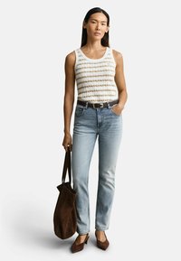 Femme aux longs cheveux noirs portant un haut sans manches beige à rayures blanches, un jean bleu clair, une ceinture marron, et un sac en suède marron sur l'épaule.