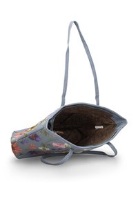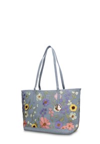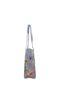 Sac fourre-tout en tissu bleu tissé avec des fleurs multicolores brodées et deux longs anses, avec une petite étiquette de marque métallique ronde.