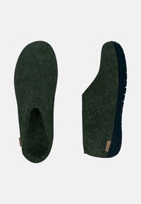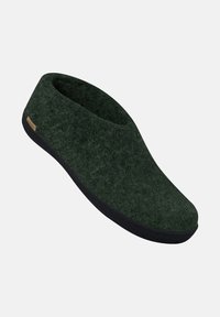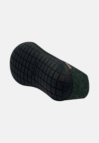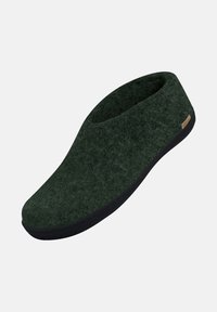Chaussure en feutre vert foncé à enfiler avec semelle en caoutchouc noire et coupe basse à la cheville, conçue pour une utilisation décontractée en intérieur ou en extérieur.