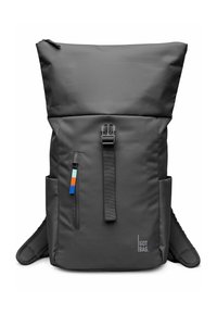 Sac à dos noir à fermeture roulera avec poches latérales, poche avant verticale zippée avec tirette multicolore, et logo "GOT BAG" en bas à droite.