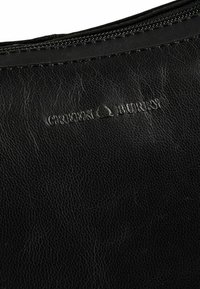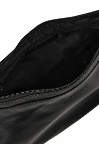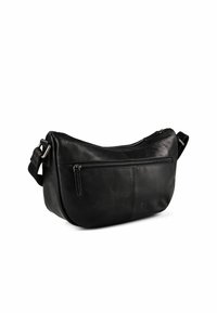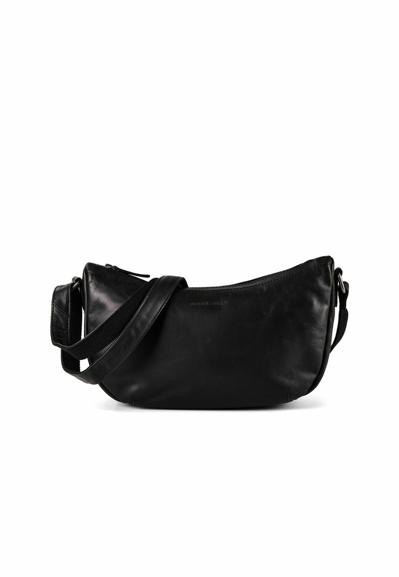 Sac à épaule en cuir noir en forme de croissant avec sangle réglable et fermeture éclair, texture lisse, design minimal.