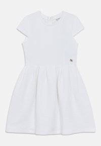 Robe blanche sans manches avec une jupe en satin superposée, accent nœud, et logo doré. Comprend un bloomer blanc assorti.